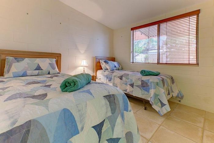 Three bedrooms in total, with two queen beds and two king singles. A full ensuite bathroom off the main bedroom, and a second family bathroom completes the house.